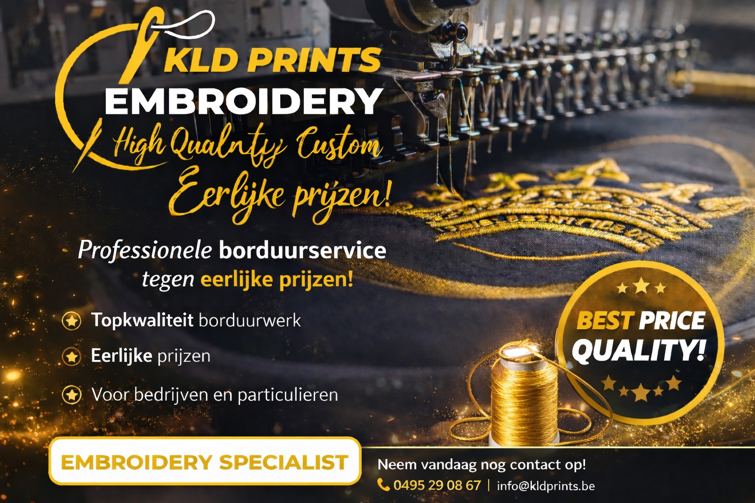 Bij KLD Prints borduren we kleding en accessoires in ons eigen atelier. Elk ontwerp wordt met zorg uitgewerkt op professionele borduurmachines, zodat je kan rekenen op een sterke, nette en duurzame afwerking. Geschikt voor zowel particulieren als bedrijven die kwaliteit belangrijk vinden.